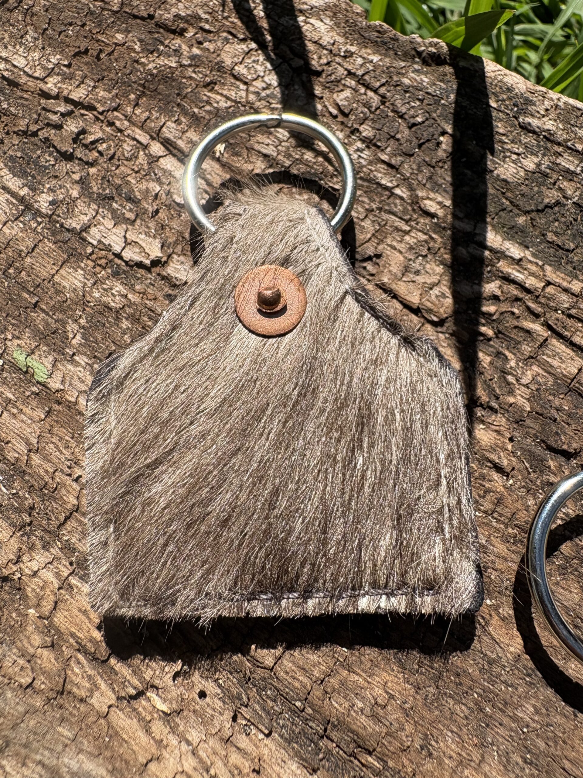 Este chaveiro exclusivo é confeccionado em couro com pelo natural, cortado no formato tradicional de brinco de boi, trazendo a essência autêntica do universo country para o seu dia a dia. Cada peça possui padrões únicos de pelos, garantindo que nenhum chaveiro seja igual ao outro.