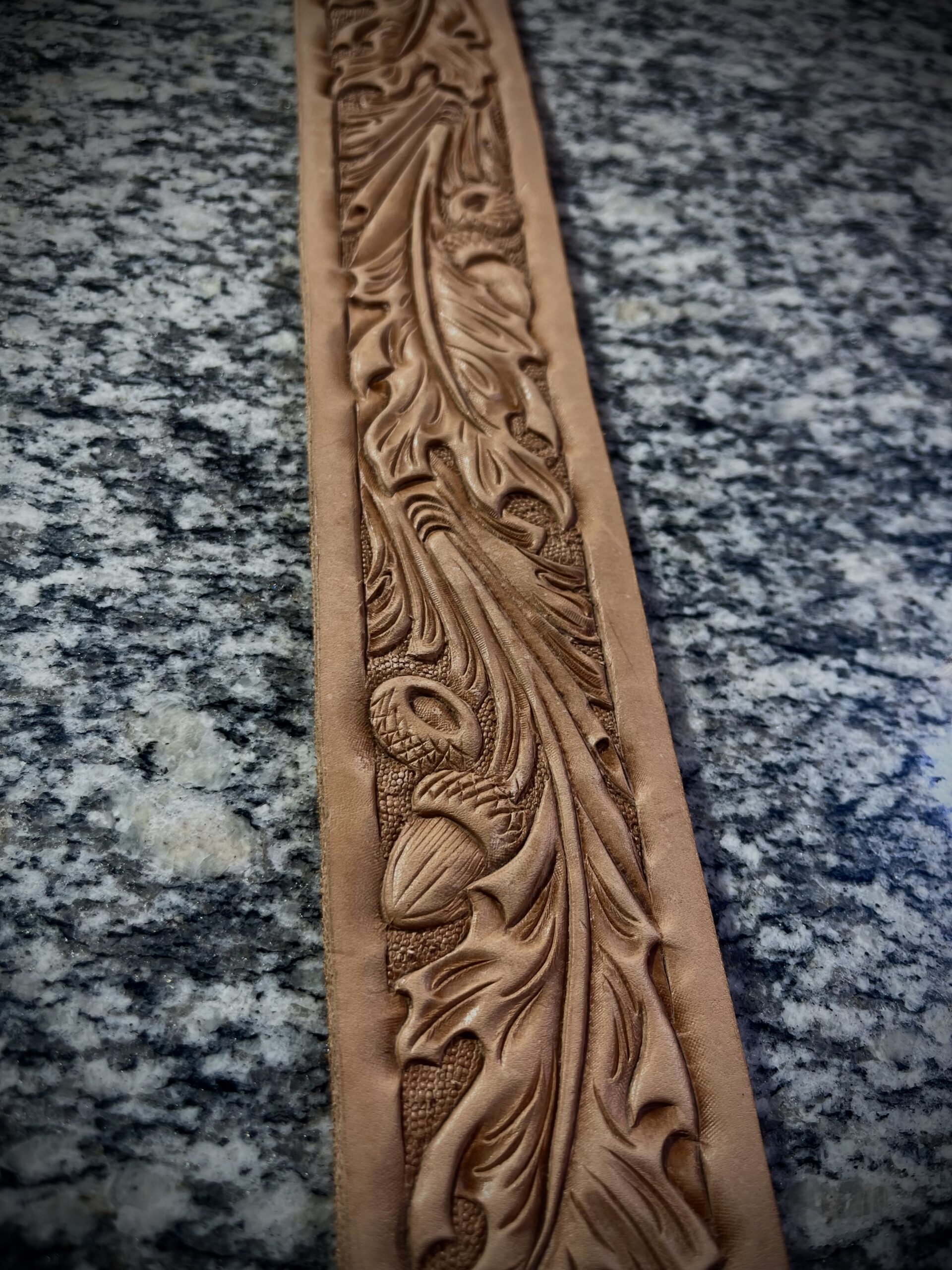 Com traços marcantes e detalhes em folhas castanhas e ramos, o Modelo Castanheira é ideal para cintos personalizados no estilo country e western.